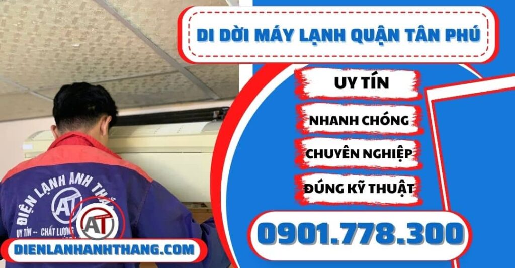 Nhiều khách hàng đang gặp khó khăn trong việc lựa chọn một dịch vụ di dời máy lạnh quận Tân Phú. Điện lạnh Anh Thắng sẽ giải quyết vấn đề này cho bạn, bạn chỉ cần gọi tới HOTLINE: 0901778300. Chúng tôi cam kết di dời máy lạnh nhanh chóng, nhân viên sẽ có mặt sau 30 phút liên hệ. Có bảo hành lâu dài 100%.